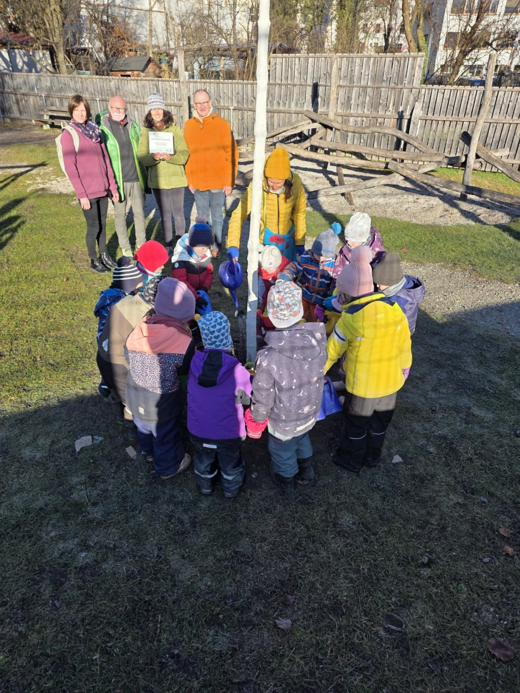 Der erste Baum des Programms: Gepflanzt im Weilheimer Kindergarten Pfiffikus durch eine Spende der VR Bank Werdenfels. Im Bild: VR Regionaldirektor, Franz Bauer, zusammen mit Weilheims zweiter Bürgermeisterin, Angelika Flock, und Vertreter:innen des Fördervereins der Weilheimer Agenda 21 und des Kindergarten Pfiffikus.